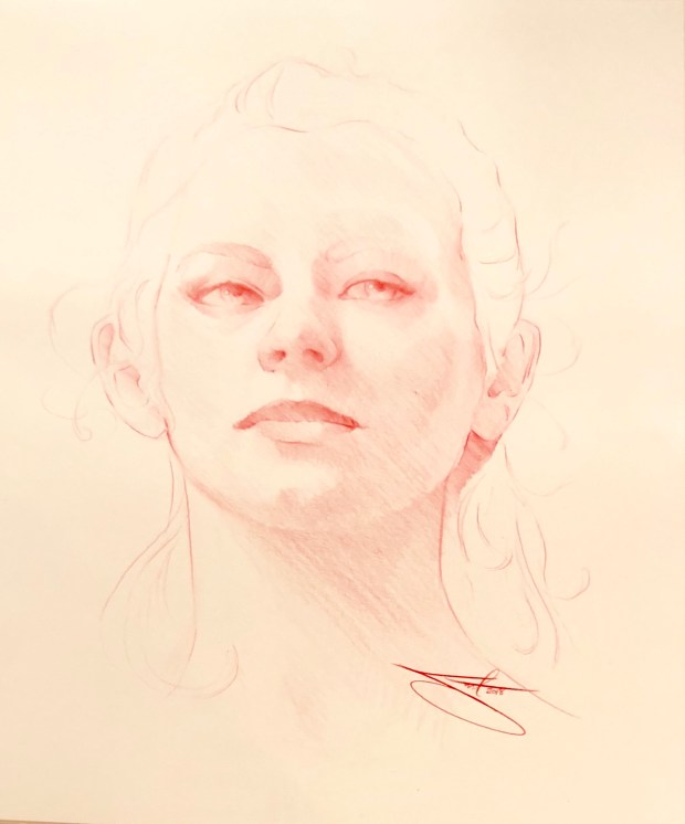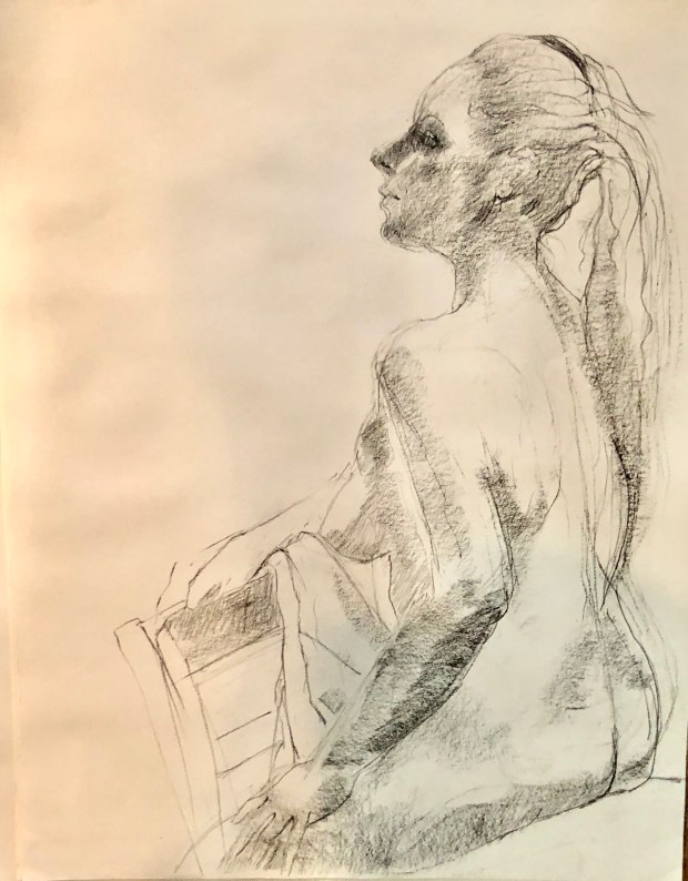 Her head had been too small so I added more hair and moved the eye. Eeek. And the upper arm too short. I erased the line at the top. Came right off. Sometimes they do sometimes they don’t.