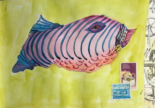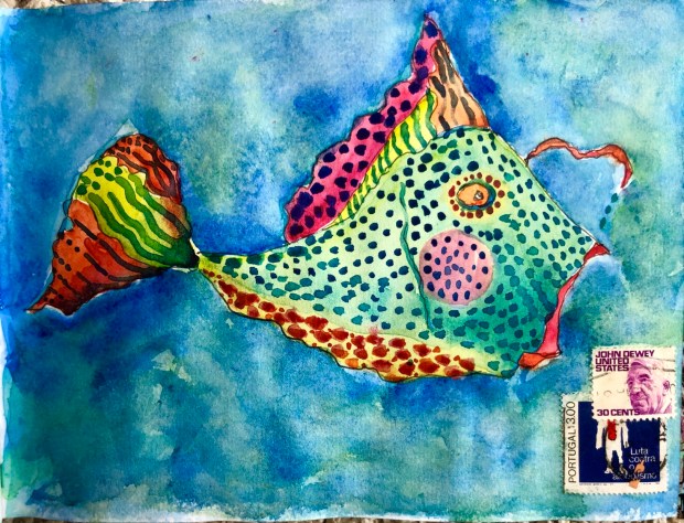 I was having so much fun painting this fish despite the marker streaks I got out my 2 watercolor travel boxes and some sable paint brushes and curled up on the sofa to play.