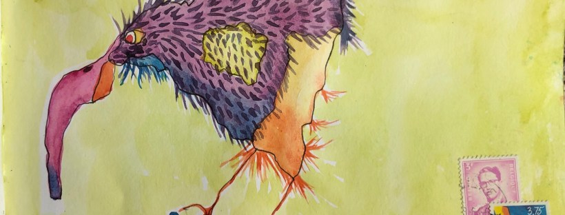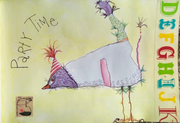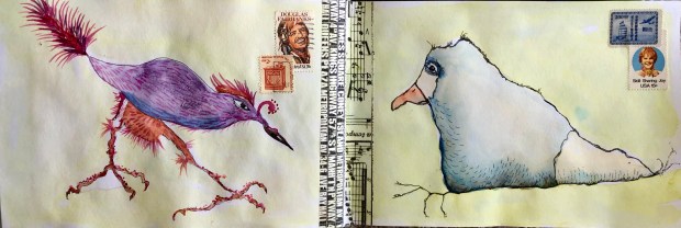 A bird whose definitely make I think. He needs a name. I also have bags of old stamps that I decided to glue onto the pages to fill it up.