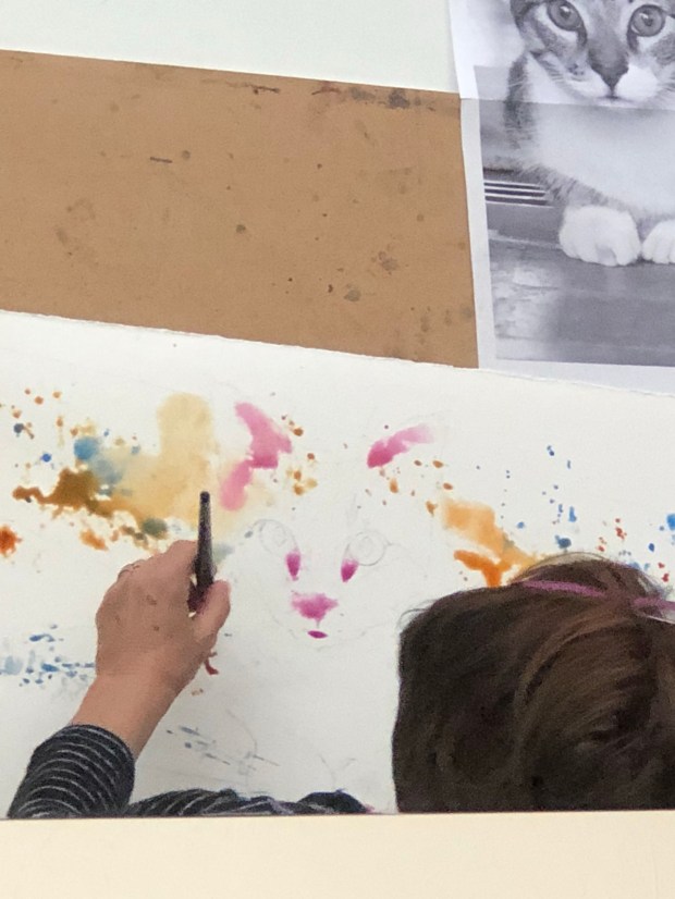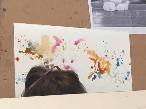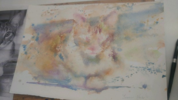 Background first. Spritzing. And dripping. Cerulean, burnt sienna, mineral violet.