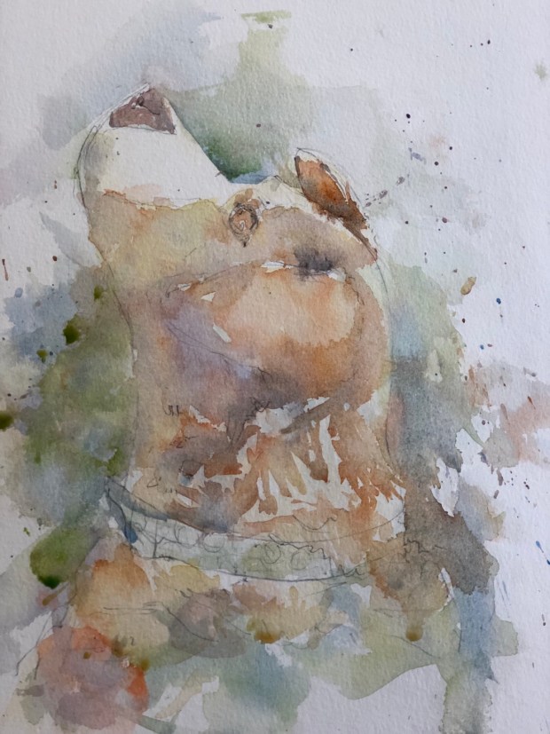 Scootch Man. Quarter sheet 10×15 300# All done but his splatters and maybe that white spot near his ear. No idea why it’s sooo white.