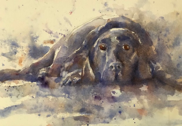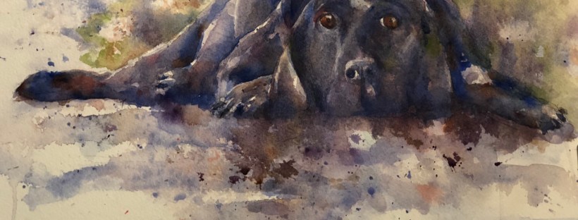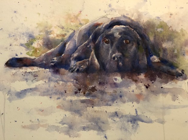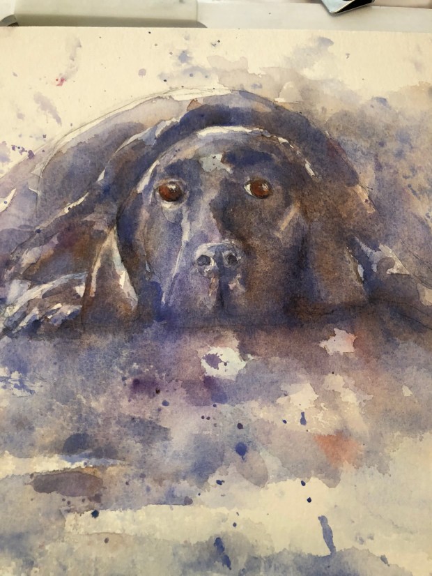The start. This is a really slow process. It’s like bringing the ghost out into the light. LOTs of water. Ultramarine blue and quin sienna. And probably some dioxzine purple.