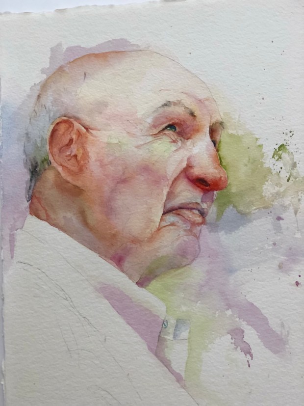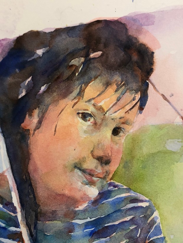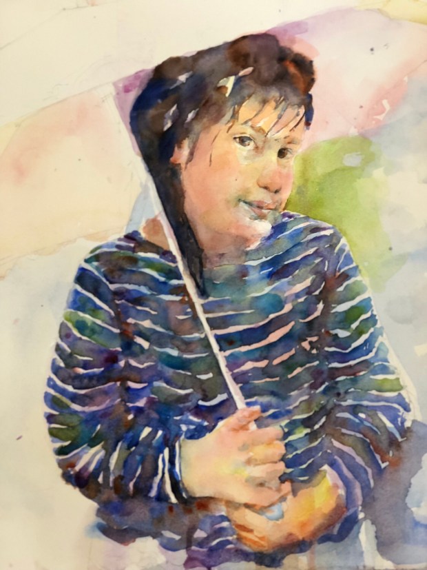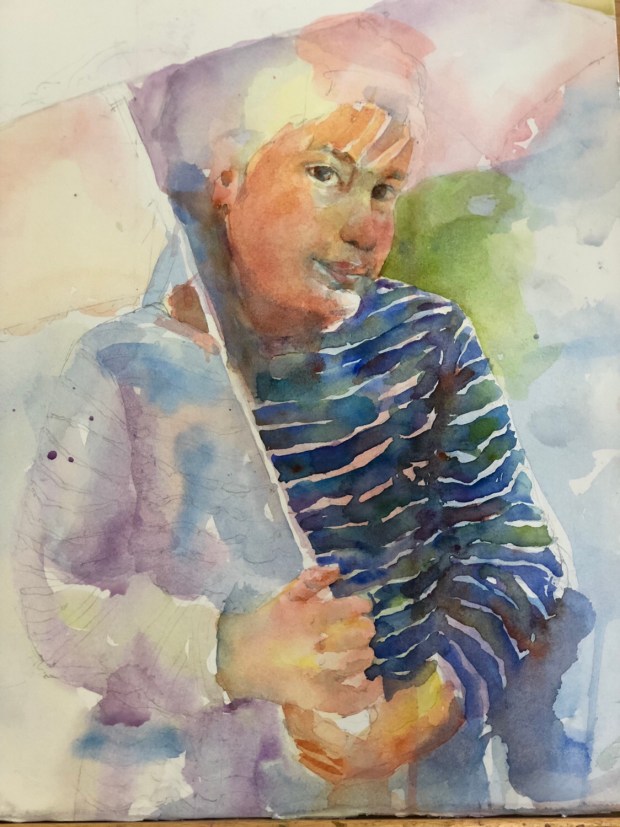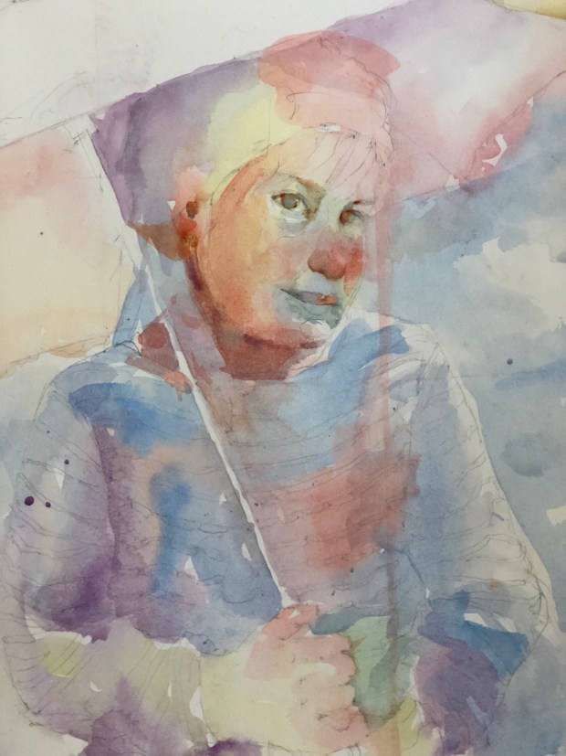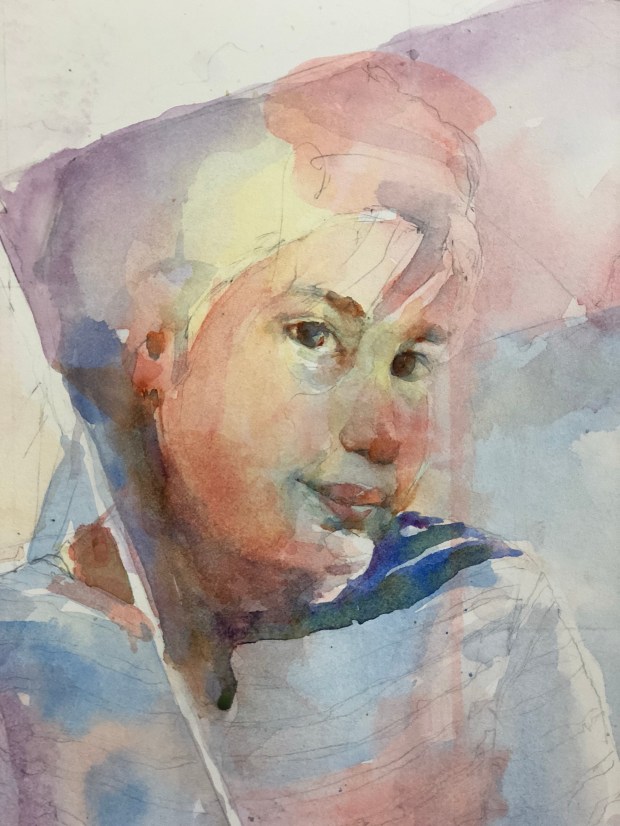 The start. This is a really slow process. It’s like bringing the ghost out into the light. LOTs of water. Ultramarine blue and quin sienna. And probably some dioxzine purple.