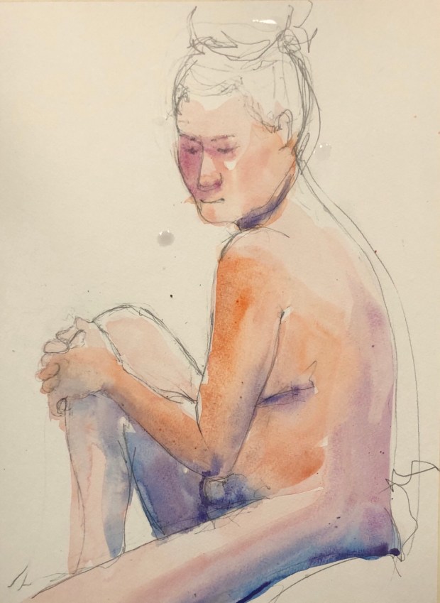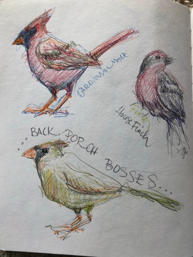 Or out my back door at the bird feeder. Fun sitting on the sofa watching the silly things. They squabble and fight. Chase each other off especially the squirrels and the cardinals. Aka no sweat involved in bird sketching plein air right?!! ππ π€£