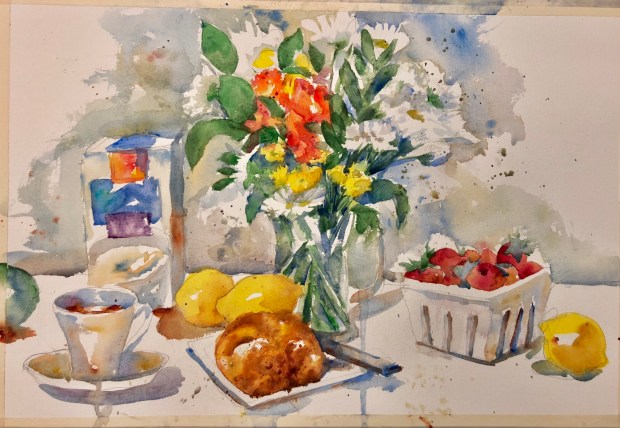 And I added some darks to the flowers and lifted some greens. Straightened the biz of grits. More greens to strawberry tops.
