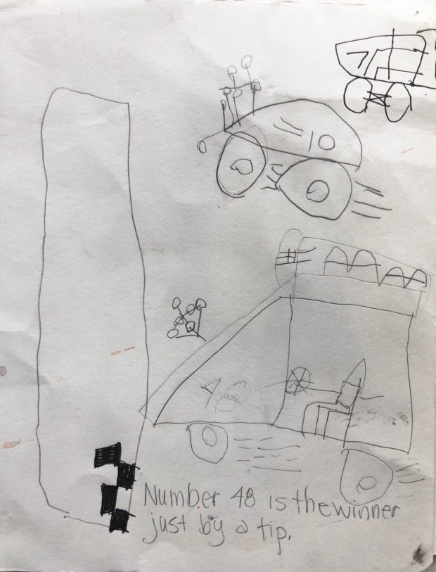 Here’s what he drew. He lives drawing cars and trucks.