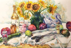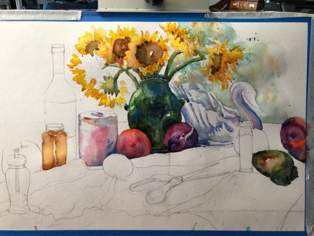 I even bought an interesting shaped bottle of olive oil today. Calling this painting Ratatouille because of the veggies in it. Just couldn’t do another eggplant aka Barney painting.