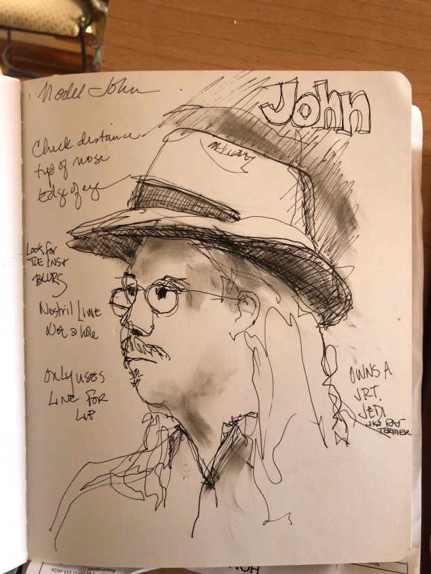 Sketch 2 of John but more importantly his adorable Jack Russell Jedi. What a great dog!! And the hat drawing went much better.