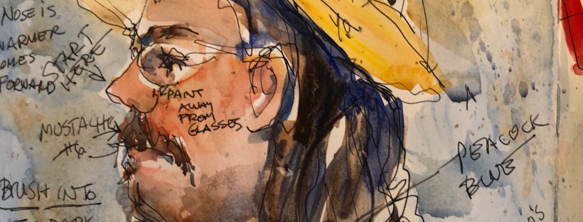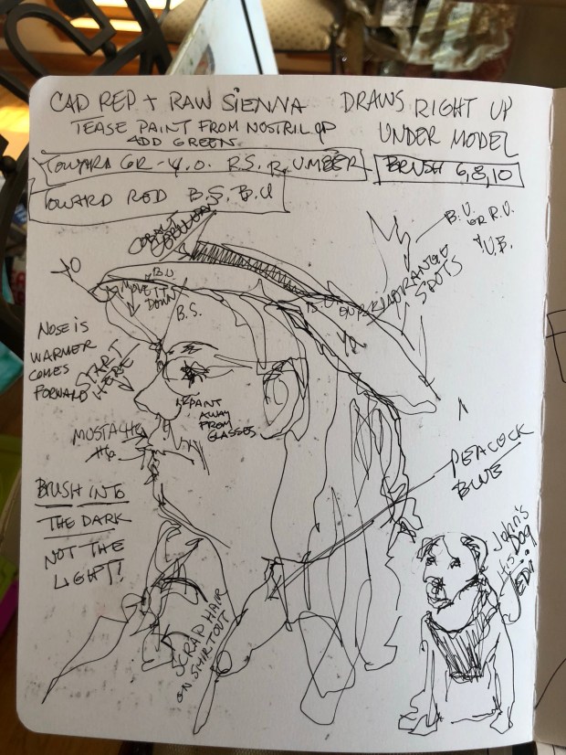John one of our models in Savannah in my sketchbook. His hat is really a bit too high on his head. Oops.