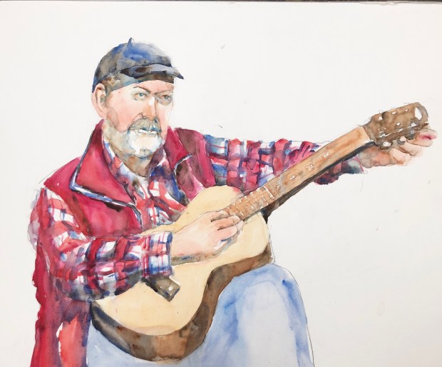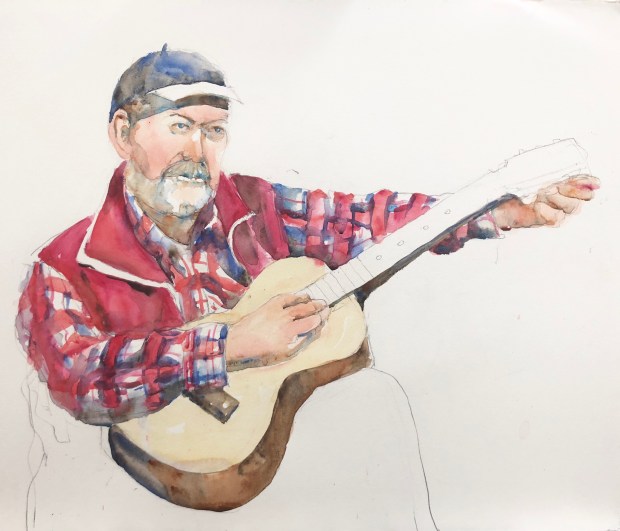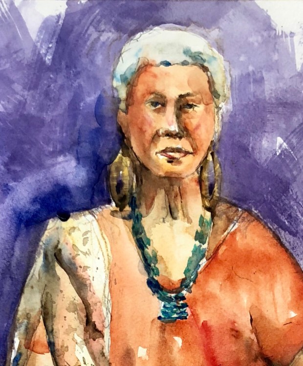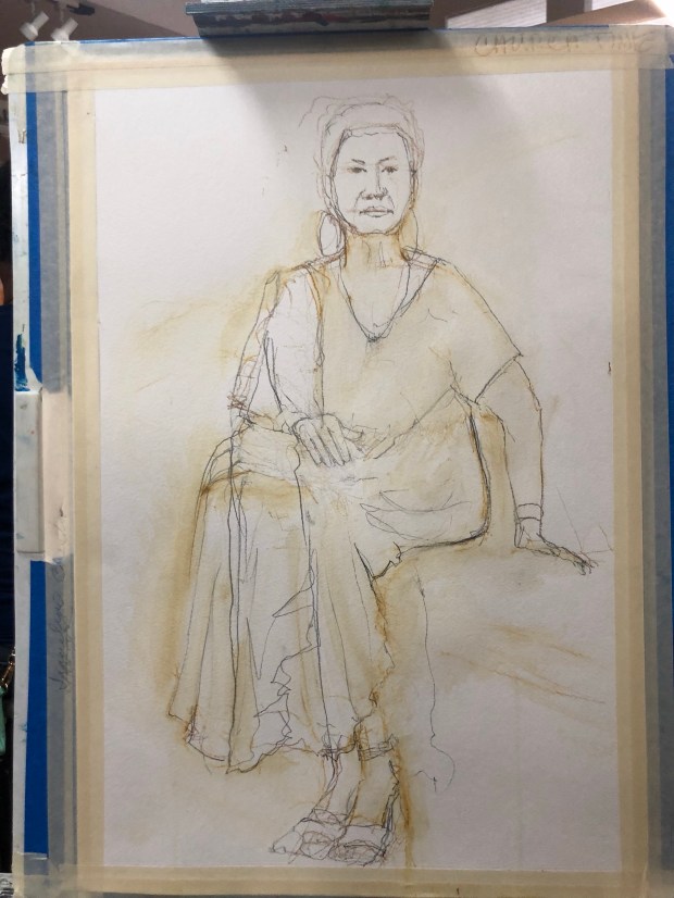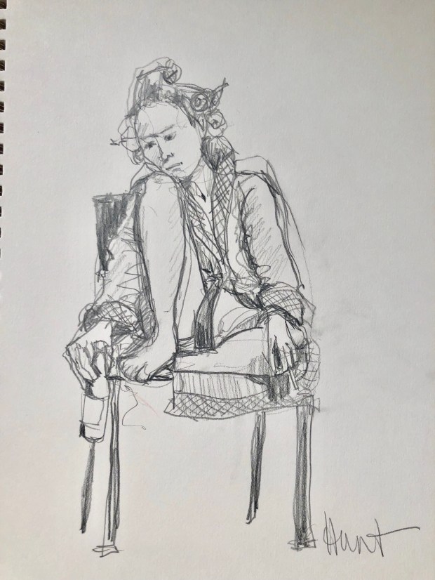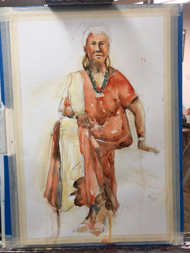 We set a timer and only could draw and paint for that time. Some dummy left her sketchbook at Ruth’s and then ran out of water. Duhhh. Had to dig out my 10 davinci and sacrifice my water bottle. I used a Derwent 2B pencil and held it up the pencil near the end like a brush to draw this on Arches 280#cold press paper . Painted it with my whiskey painter box full of winsor Newton wc from my old WN travel palette that fell apart.