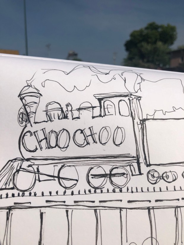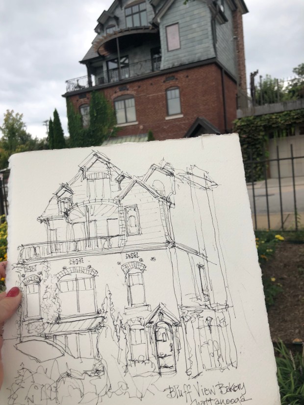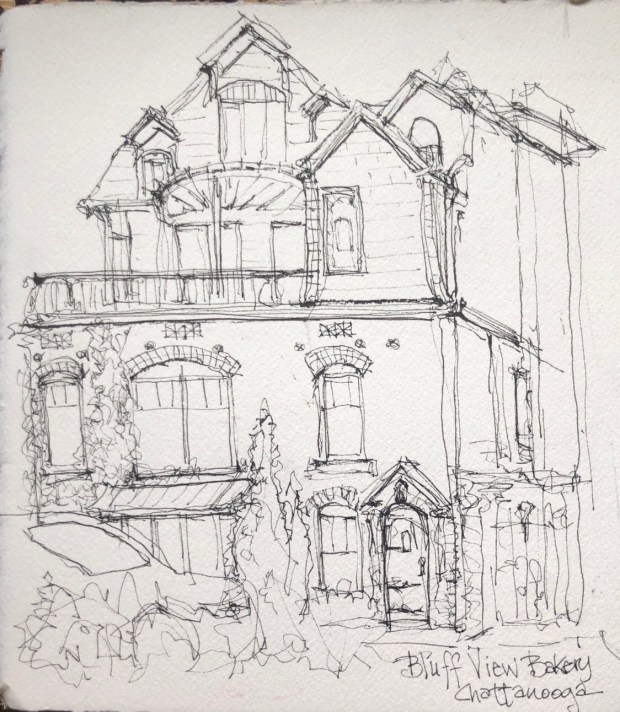 Also drew the Chattanooga Choo Choo billboard this morning from the parking lot of Niedlands Bakery. The Choo Choo sign is the little grey bump in the sky above my sketch. Might have been a perfect opportunity to use my elegant writer but I didn’t think about it.