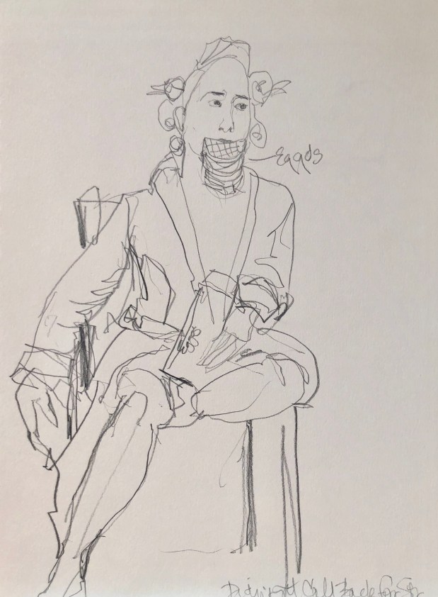 Stuffing her feelings with eggs. She really had five or so in her mouth. While we were drawing this pose Chris our Mc told us that Pepper had a costume fitting for the next season of Stranger Things series on Netflix but didn’t get a call back. Darn we could said we knew her when.