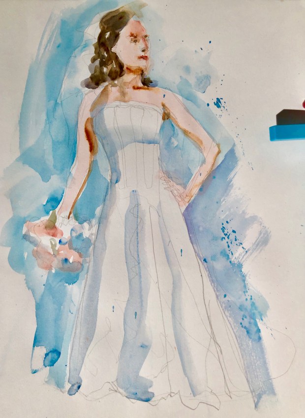 Our next story was about a bride. She did make a beautiful bride. Had to work hard not to make her to voluptuous. I have to say she was rock still as a model. Sorry for the rotten pic. Too lazy to go get my sketchbook out of the car.