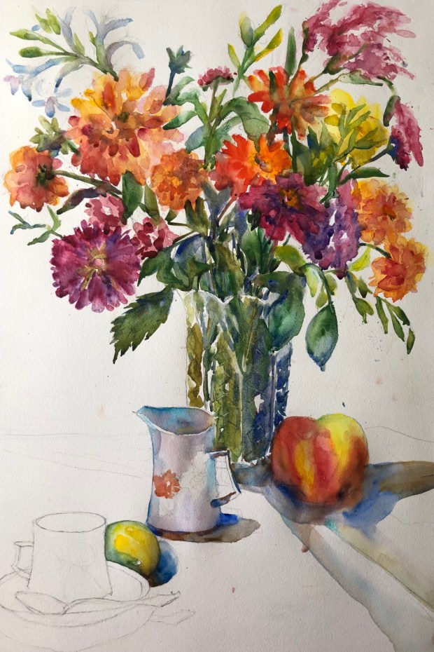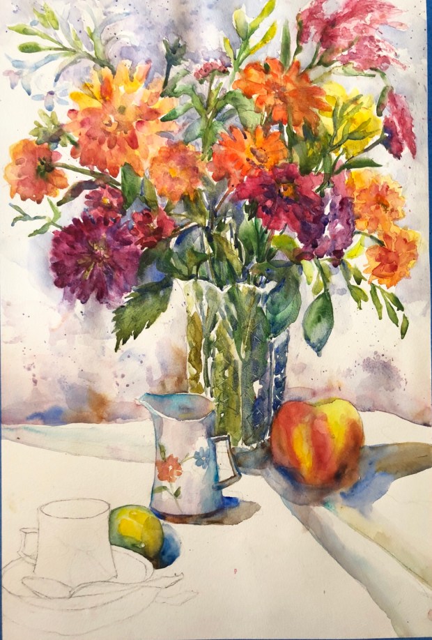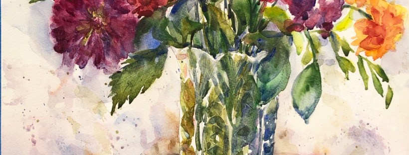 I had a lot of trouble with the peachy dahlias and the purple and orange zinnias. I finally got out my quin red and quin magenta which helped a lot. I might repaint them using alizarin. I thought the colors were getting muddy. The Quins and alizarin are transparent so wouldn’t do that.