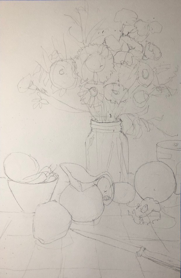The sketch. Drawn with a 2 B staedler and then erased to lighten the lines.
