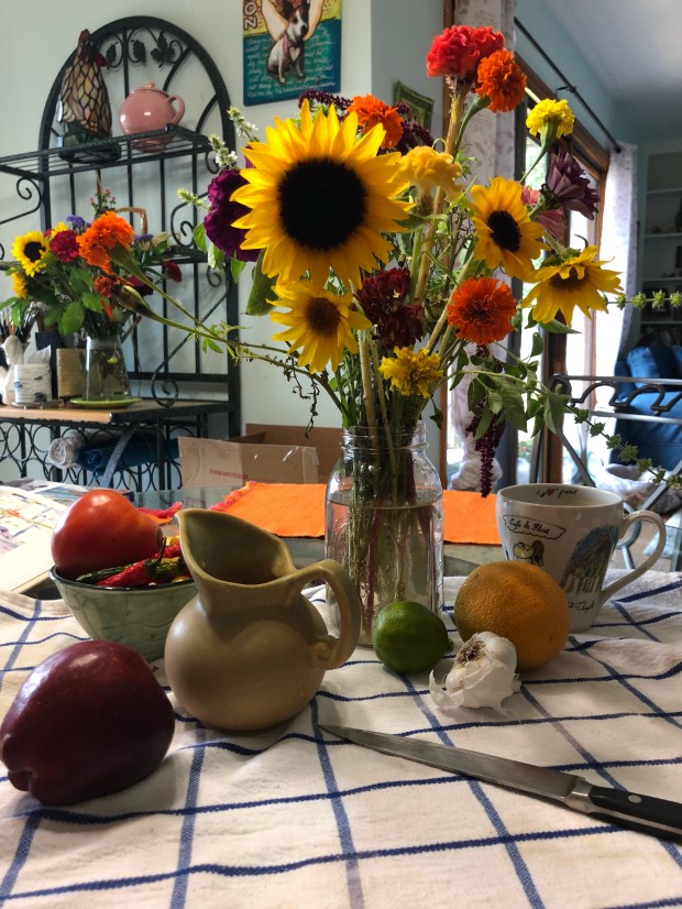The bouquet. Now mostly in the trash. Those zinnias go quickly. However the marigolds seem to last forever.