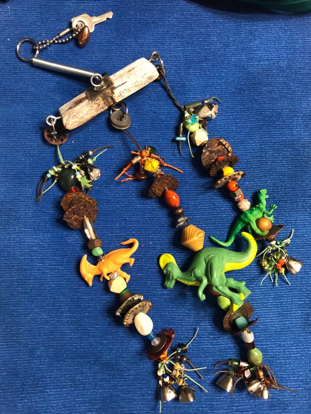 Been busy delivering paintjngs to Columbia for the show and speculating if we will be at Edisto Beach next week. Florence is visiting there too. This is a funky junk wind chime i got for my grandson the Dino nut. My sister and I decided they would be fun to make out of old discarded toys.