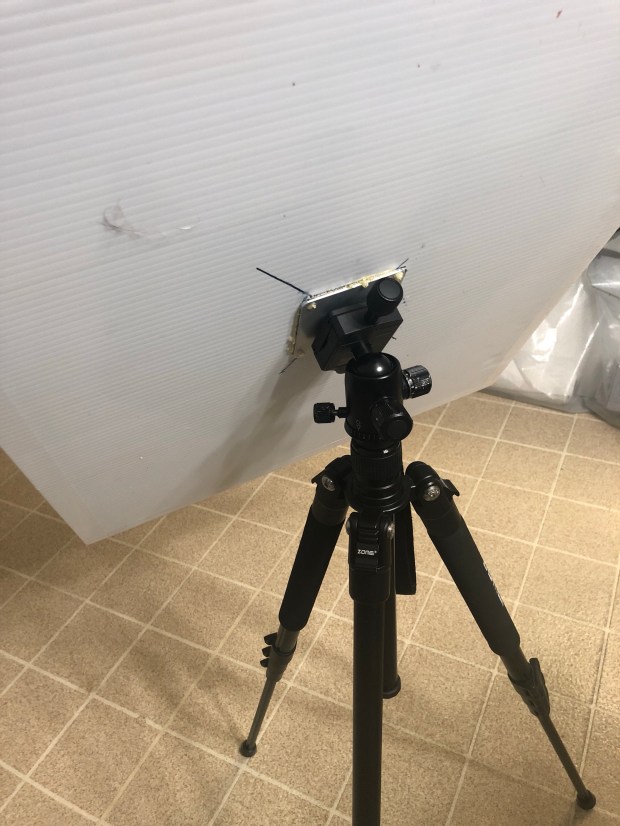 Here it is showing the tripod. The board will pop off to make carrying easier. I probably should add a handle or cut one out with my packing knife and tape it too. We shall see.