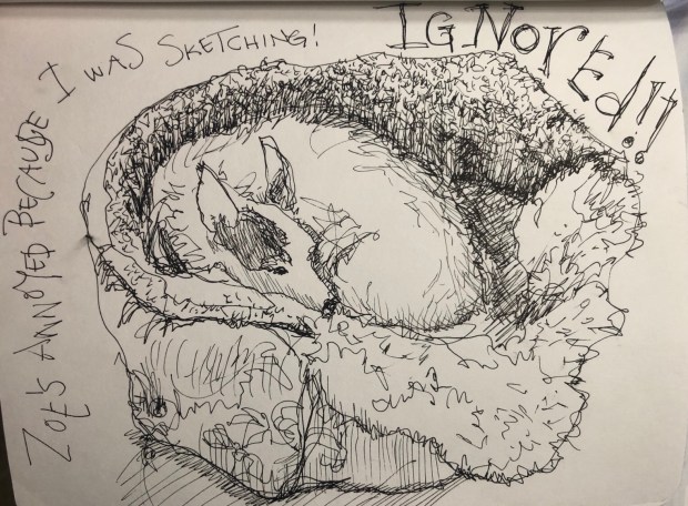 Zoe ignoring me in her basket. There is a dog in the middle of all that inky texture. Really there is. Maybe I should call this find the dog?! đ