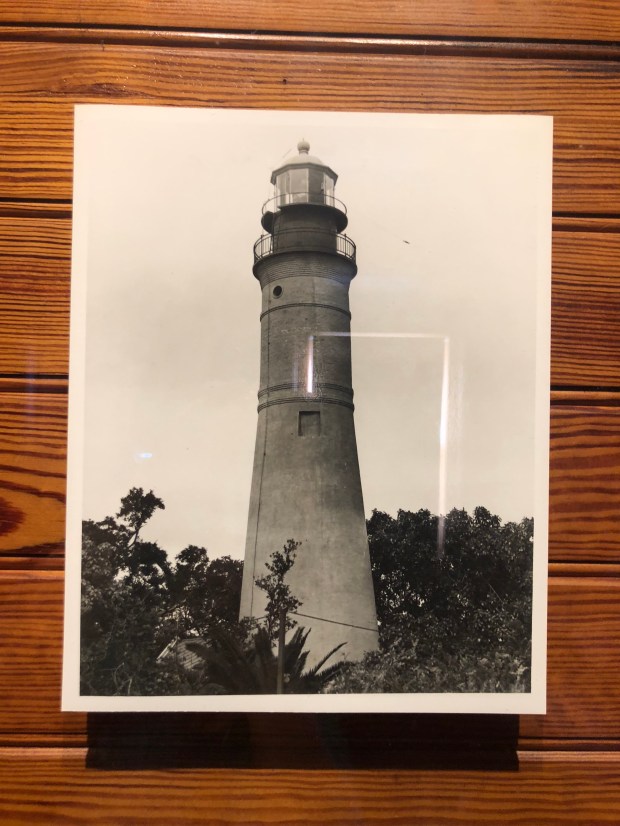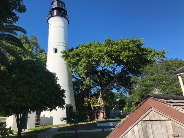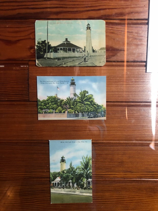 The first lighthouse in Key West was built in 1825 along the shoreline at Whitehead Spit. Lieutenant (later Commodore) Matthew C. Perry recommended its construction to warn ships off of the treacherous shoals surrounding the island. It was a whitewashed brick tower, 47’ high from its foundation to the base of its black iron lantern. Fromhttp://www.kwahs.org/museums/lighthouse-keepers-quarters/first-lighthouse-keepers