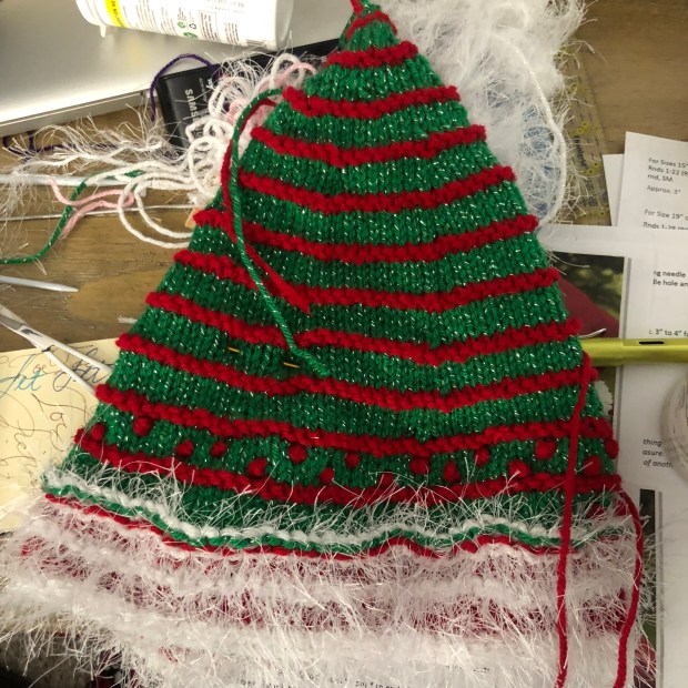 Lots of French knot ornaments and some twizzles to knit for the top.