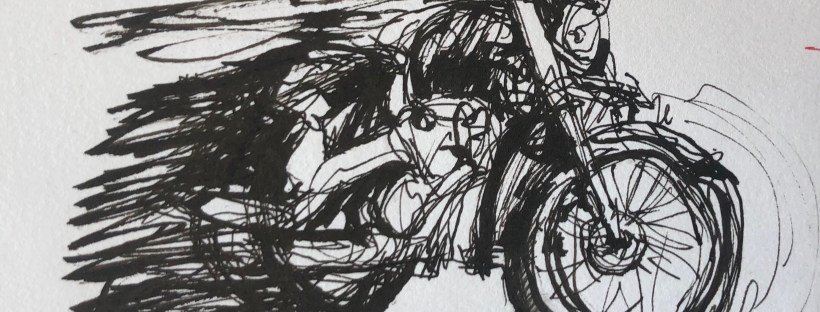 A Harley Sportster drawn with the Namiki Fude. Love the action in this. All the streaks on the left were where I was covering up that I made the body too long and then I shortened it. Who knew it would make it looks like it was ready to zoom down the road on a gorgeous afternoon??