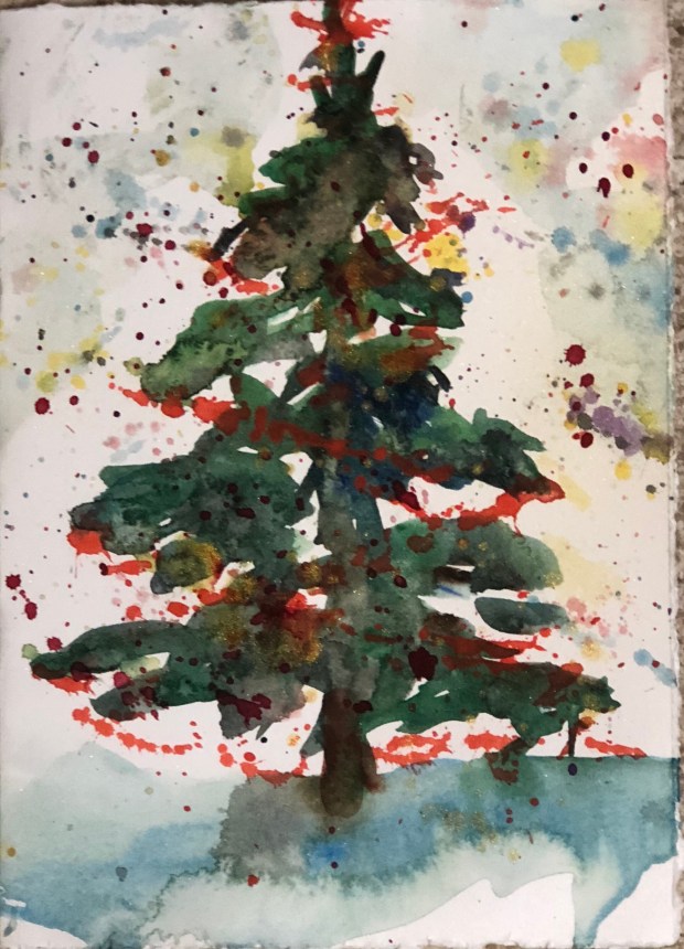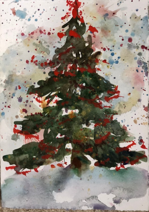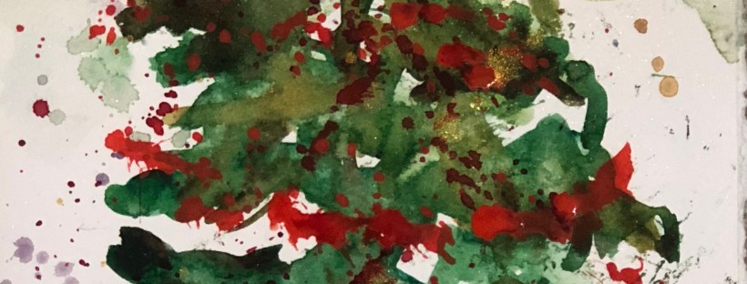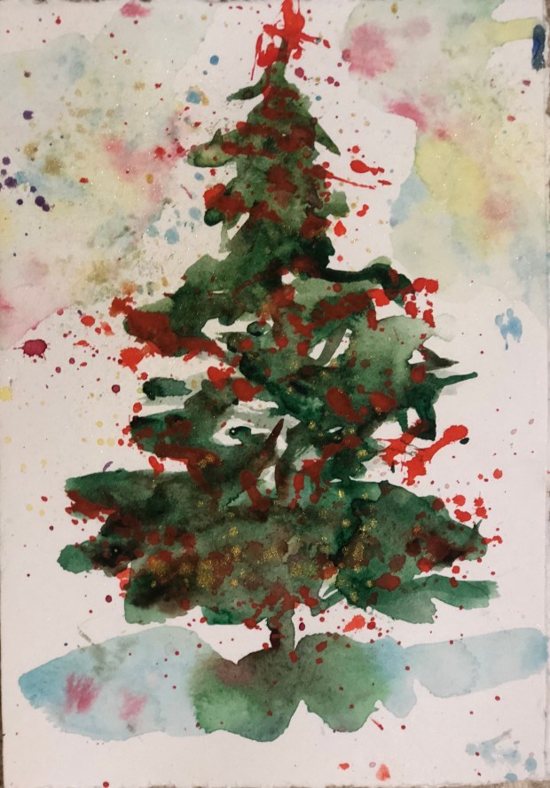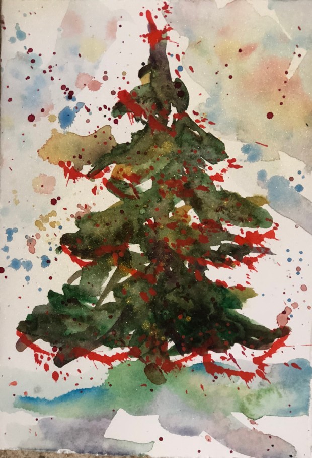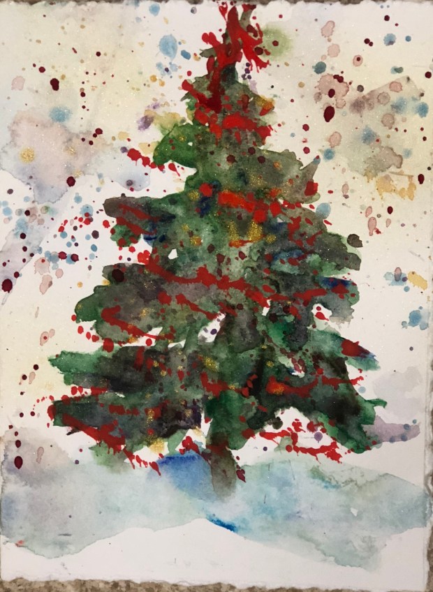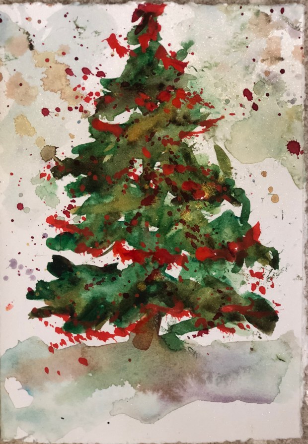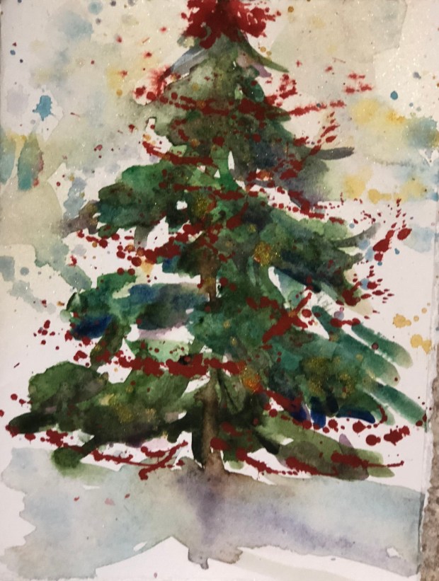 Step 5. Splatter garlands and Star with a size 8 kolinsky sable and cad red light because it’s opaque. Cad yellow deep would work too.