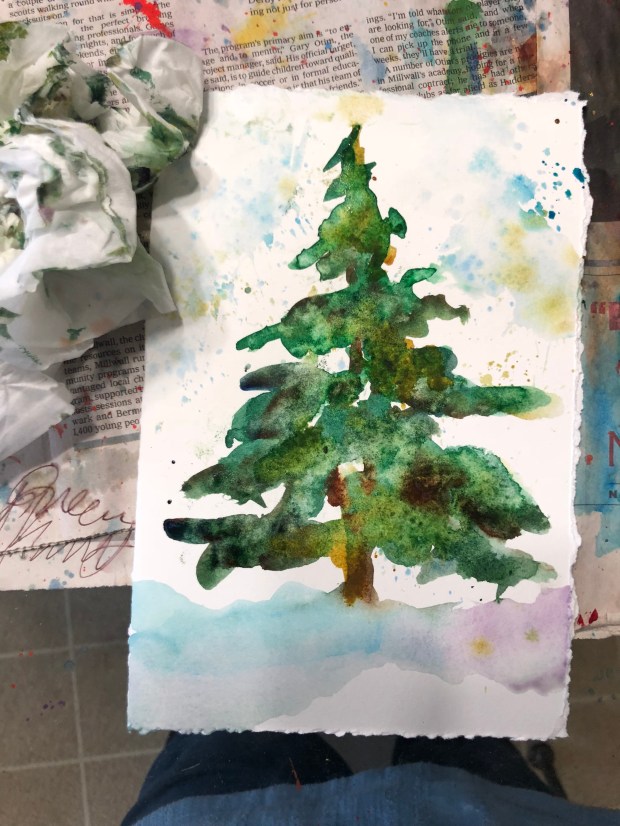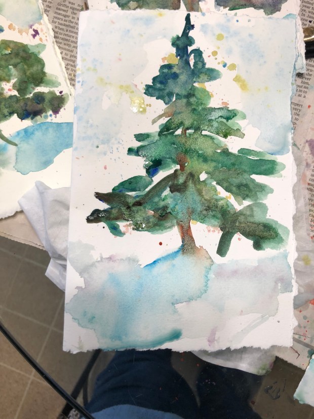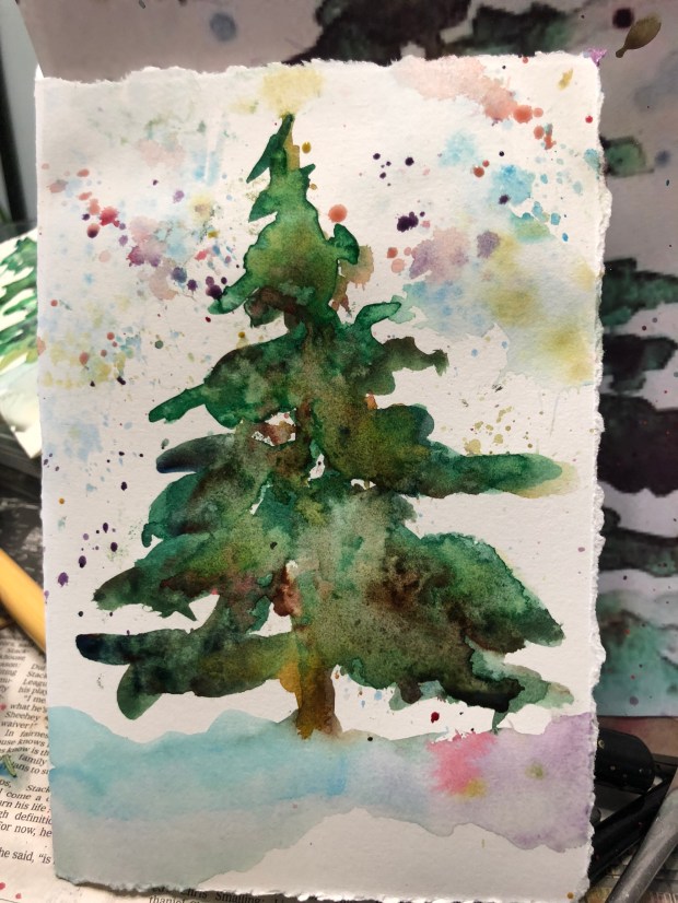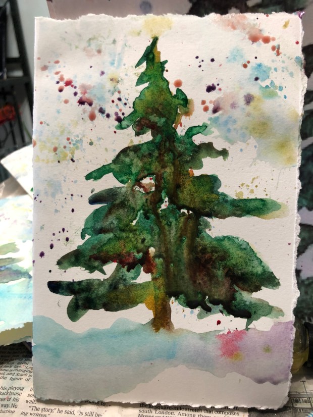 Put some soupy cerulean on for sky. I roll my brush to make a sky effect. This probably should have been done first BUT I am always too impatient to get to the tree. I also splatter some soupy quin gold and mineral violet on the tree and the sky.