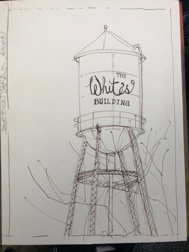 The old Whites water tower was gleaming in the midday sun glowing against the bright blue winter sky.