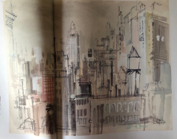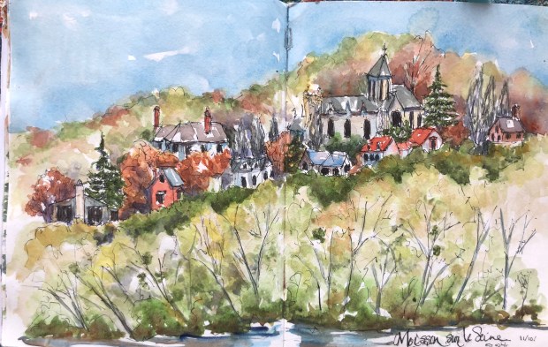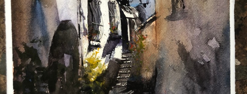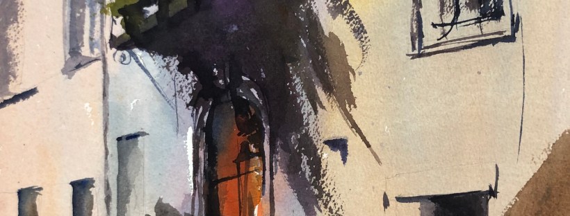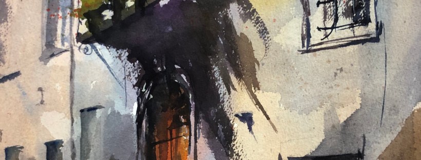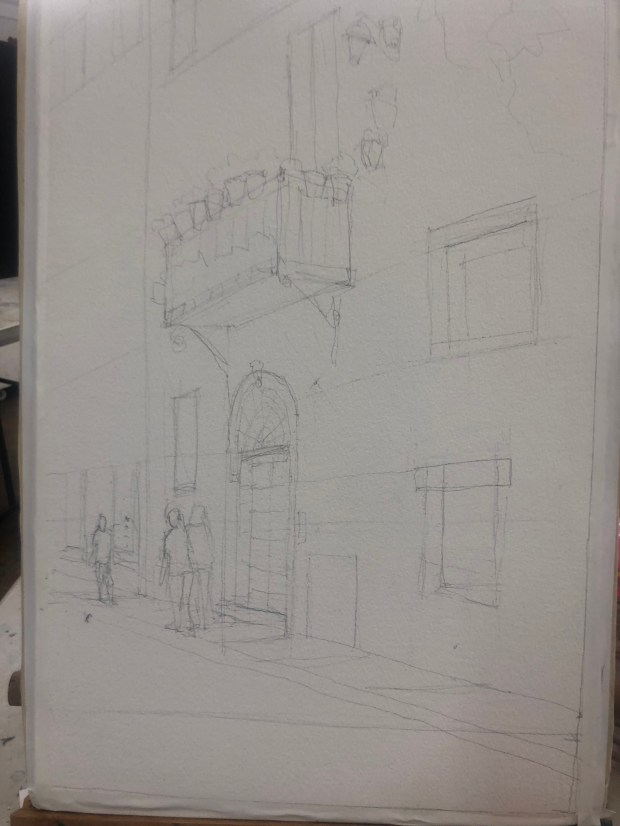I got into trouble AGAIN. Groan. I did my shadow wash to the wrong line on the drawing. I thought the wire line was where it was supposed to stop. I was painting so fast doing the wash I didn’t notice. I was going to flip it over and start again or paint white gouache over the left side when Vlad said no. Got a sea sponge and taped off the left section and the arch and blotted off the errant wash. Now I have to go back and repaint the windows.