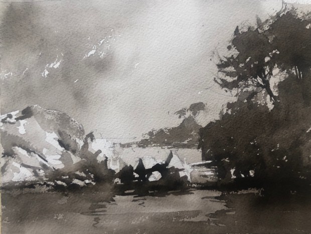Thinking tomorrow or Thursday will try the beach scene we did the sepia sketch of. Lost my focal point but I can fix it in the final one. Should have been in the middle.