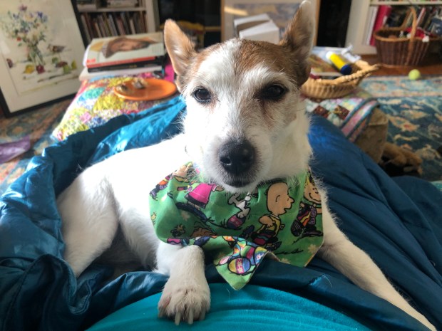 She has on her Charlie Brown easter scarf. What every well dressed Jack Russel wants to wear.