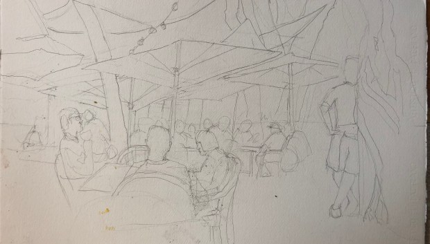 Can you find the vanishing point. Notice all peoples heads line up on the horizon line. And I tried to get all the diagonals to converge at the vanishing point. Oddly some of them don’t in this medieval town but normally they should.