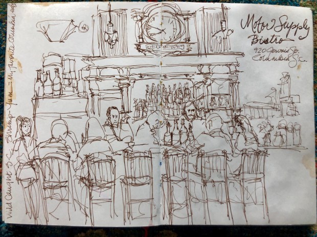 A sketch of the cute bungalow next door. To say it’s a cottage is a misnomer. It’s big. Really big. The roof is rolled like one on a British cottage. Peachy brick with yellow ochre trim.