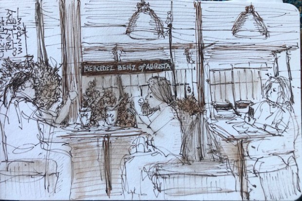 At chic fil a today. I stopped by for a salad and a deluge started so I decided to draw what was out their window.