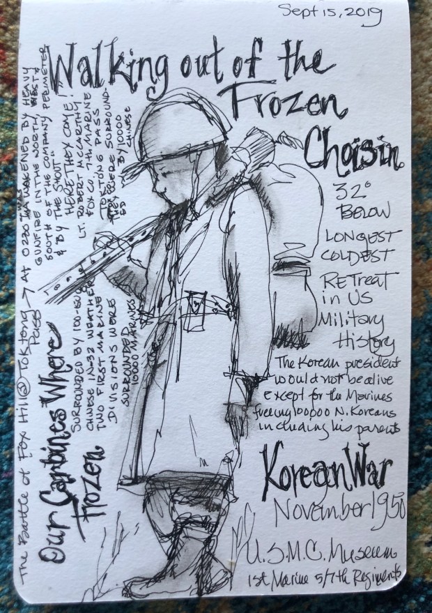 His Marine rifle company Fox Company – about 220 men – was holding the retreat at Toktong Pass all alone, surrounded by 10000 more Chinese. Everyman was wounded but half of them survived the vicious five day battle to fight their way out on the coldest longest retreat in US Military history and enter the legends of which Marines are made.