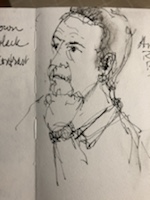 Rich Klein listening to Joe Kameen talk at USC Aiken. I am sure one day I will look back thru my sketchbooks and say I remember him. He’s the guy who started buying Lamy pens!! Aka he fell down the rabbit hole with the rest of us. Prof Rich can frequently be seen leaning on his chin while he listens intently or hmm maybe he day dreams. You can follow him at richkleinvisions on instagram. Inside his head might be quite interesting if his art work is any indication.