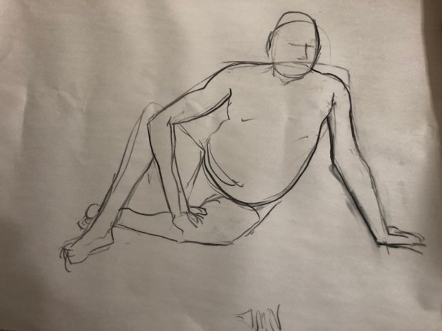 Next break. Or was this when I was done. Not sure. Painted for three 25 min sessions. Since I wasn’t thrilled with the pose I had fun playing and really like all the colors. Lots of alizarin mineral violet Cheap Joes Andrews turquoise. Some cad red and yellow and burnt sienna plus ultramarine.