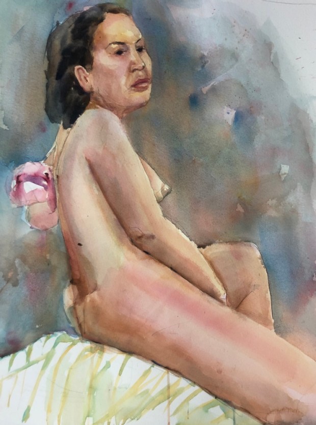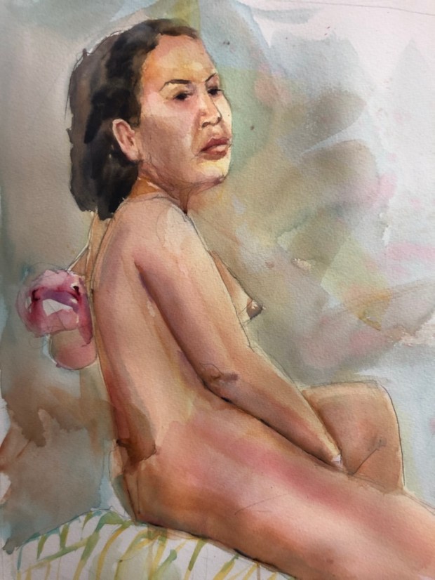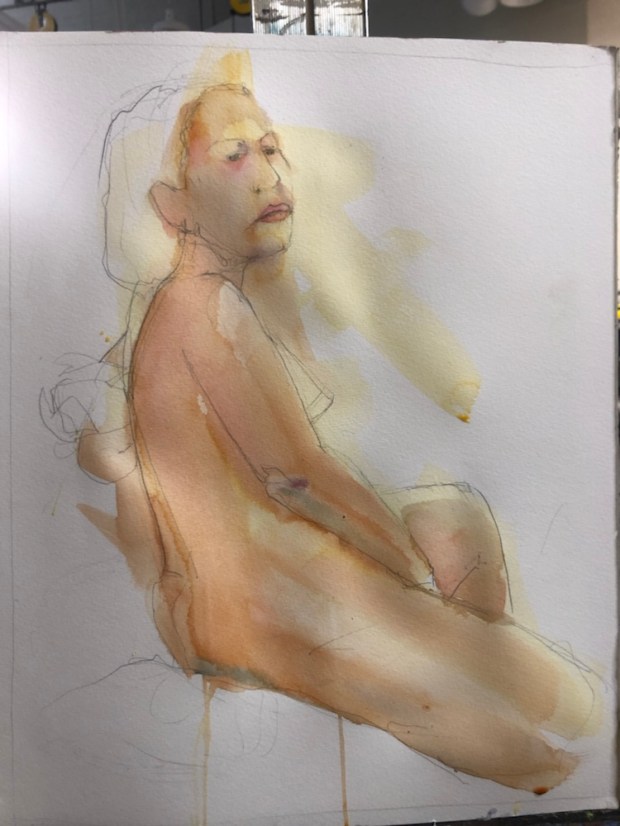 Now. I keep losing the edge across her arm and thigh where the drippy background meets the body but really liking the background. I can lift the burnt umber off the skin.