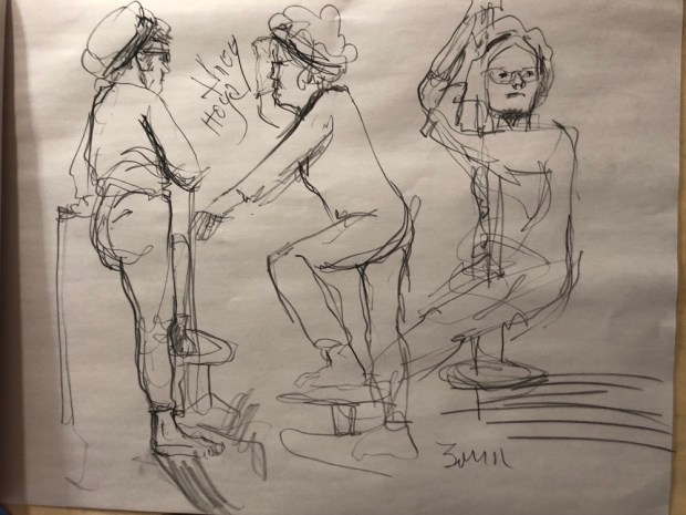 Our model was late so Joya nimbly volunteered to model for our gesture sketch session.