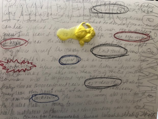 Circled random words with a grease pencil. And added yellow paint. Wish I had a nasty green yellow but nope.