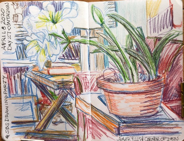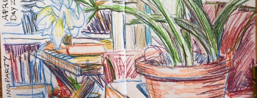 Draw the room with a plant in the foreground. Colored pencils. I used Watercolor pencils because I was too lazy to get up and find my colored pencils at 7:55. Enough just to show up. They are now found and sharpened aka ready.