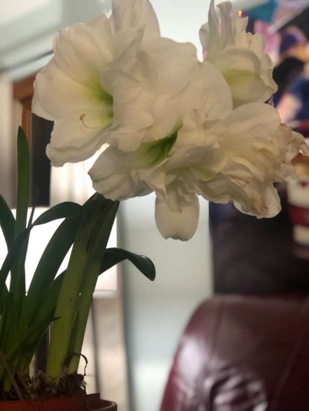 I just happened to have a great white amaryllis that I needed to bring in off the porch. What a treat to see it going crazy again around Easter. This is its third year blowing for Easter.