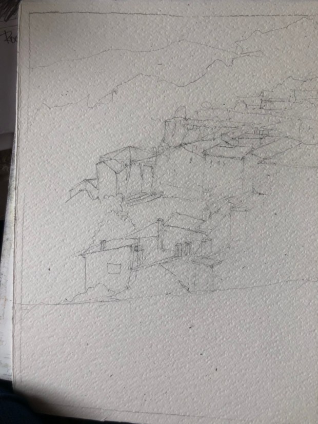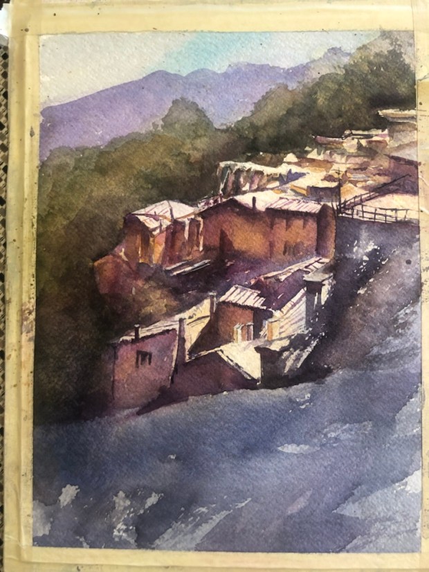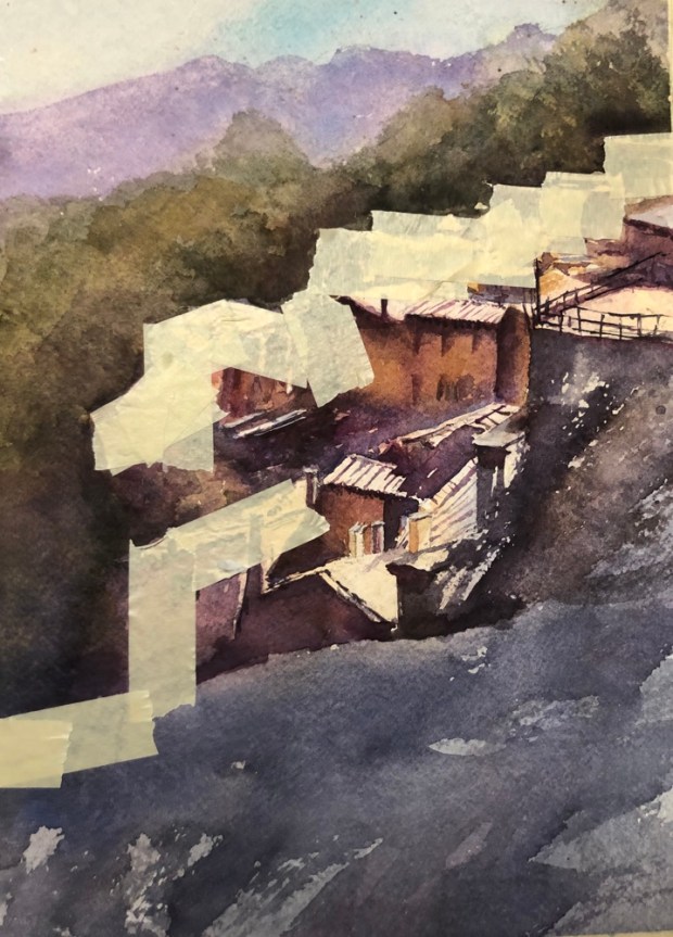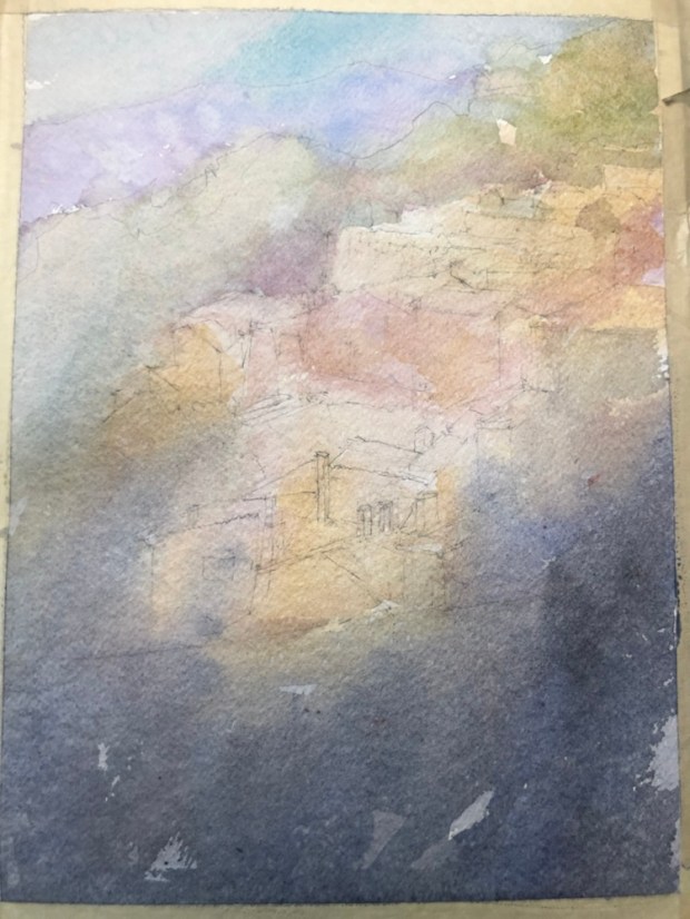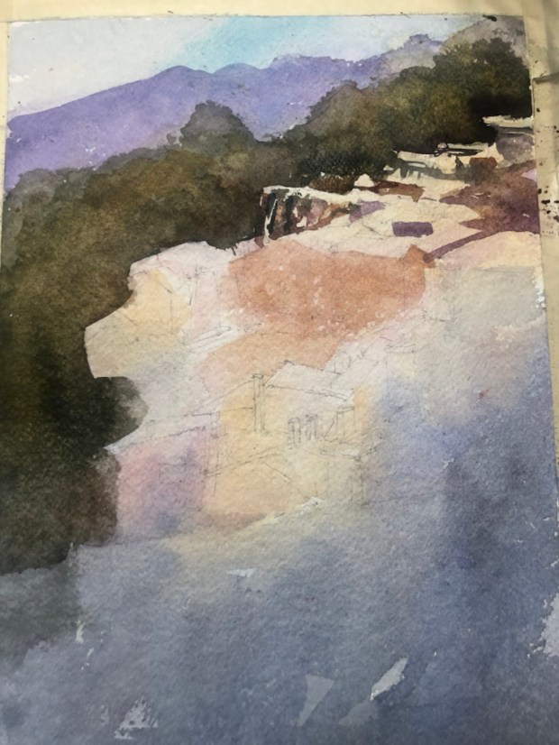 Foreground wash done. May be too dark. Painted fast and loose with a large kolinsky sable.