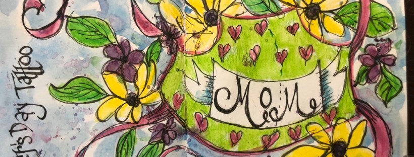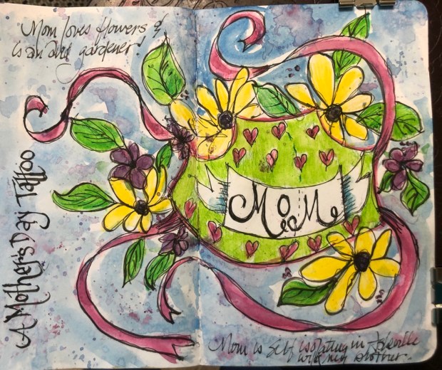 First was draw a tattoo that reminds you of your mother with Koosje on the sbsdrawingparty on Instagram today. My mom loves flowers and has quite the green thumb. I was making masks today so naturally I thought a mask surrounded by flowers for my tattoo. Moms self quarantining in Asheville NC with my brother.