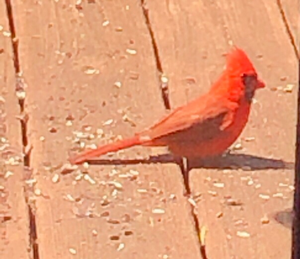 A sweet fat cardinal wallowing in bird seed on the back deck.