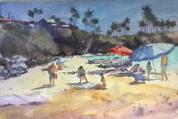 Sky wash next. Cerulean goes everywhere. Some darks on the trees.