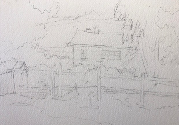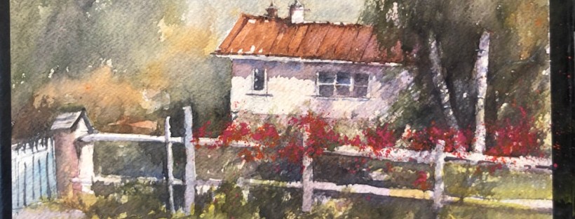 Sprinting for the finish adding dappled shadows. Watercolors all about thinking light to dark.
