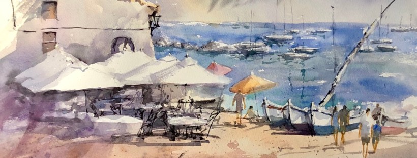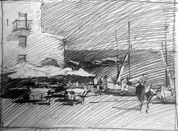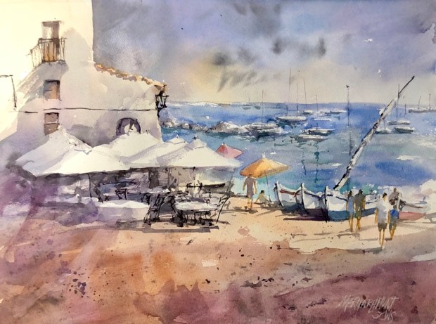 More darks esp foreground and under the umbrellas. The balcony. Playing with my saber brush which us fun to do squiggly calligraphic lines with.