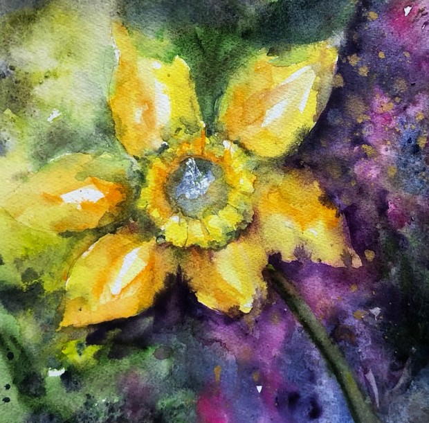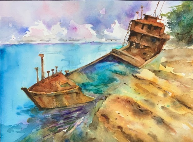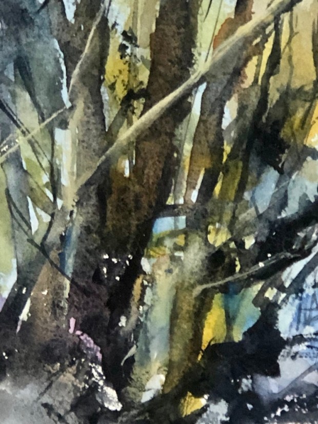 And now everything else was running together or running away. Sigh. I kept waiting for the trees to dry but no no no they weren’t. I scrubbed off the lilac grey in the foreground.